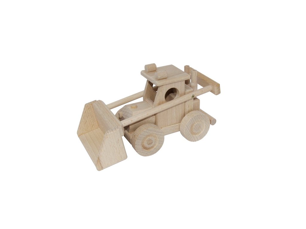Dřevěný bagr bobík je vyroben z tvrdého bukového dřeva. Bagru se točí kolečka a radlice se hýbe nahoru dolů.