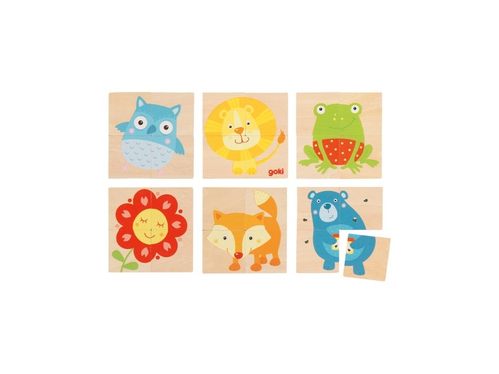 Děti poznávají zvířátka tak, že nejprve skládají obrázky. Později je možné skládat v kombinaci s paměťovou hrou. Hra obsahuje 6 motivů. Vyrobeno z kvalitní překližky.