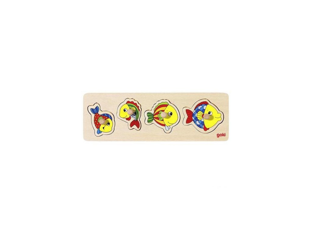 Dílky mají velké dřevěné úchytky pro lepší manipulaci. Puzzle Rybky má veselé a pestré obrázky. Vkládací puzzle jsou vyrobeny ze dřeva z kvalitní a odolné překližky o síle 0,8 cm a skládají se ze 4 dílků. TIP: Toto jednoduché puzzle můžete později připevnit na stěnu a jednotlivé dílky pevně vlepit do podložky. Výsledek je krásná dekorace do dětského pokoje – praktický dětský věšák.Doplňkové parametry
